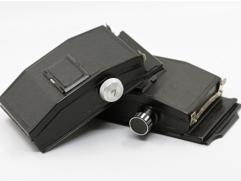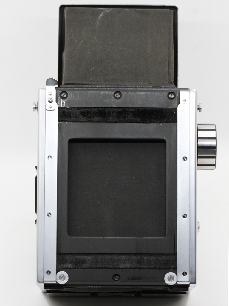 The focussing hood conforms to what most would expect, until it opens. Instead of metal you are greeted with a rubberised cloth hood which conveniently covers the viewfinder magnifier the moment the hood is opened, after which you then have to go digging for it by folding the hood half way back in again. The hood can be released by pushing down on the aforementioned tab under the name plate revealing the ground glass screen held in place by spring clips to either side. On one of my examples a fresnel screen is also fitted which improves viewing clarity immensely. However this may be an aftermarket adaptation and has not been noted on other examples, I would love to know otherwise.