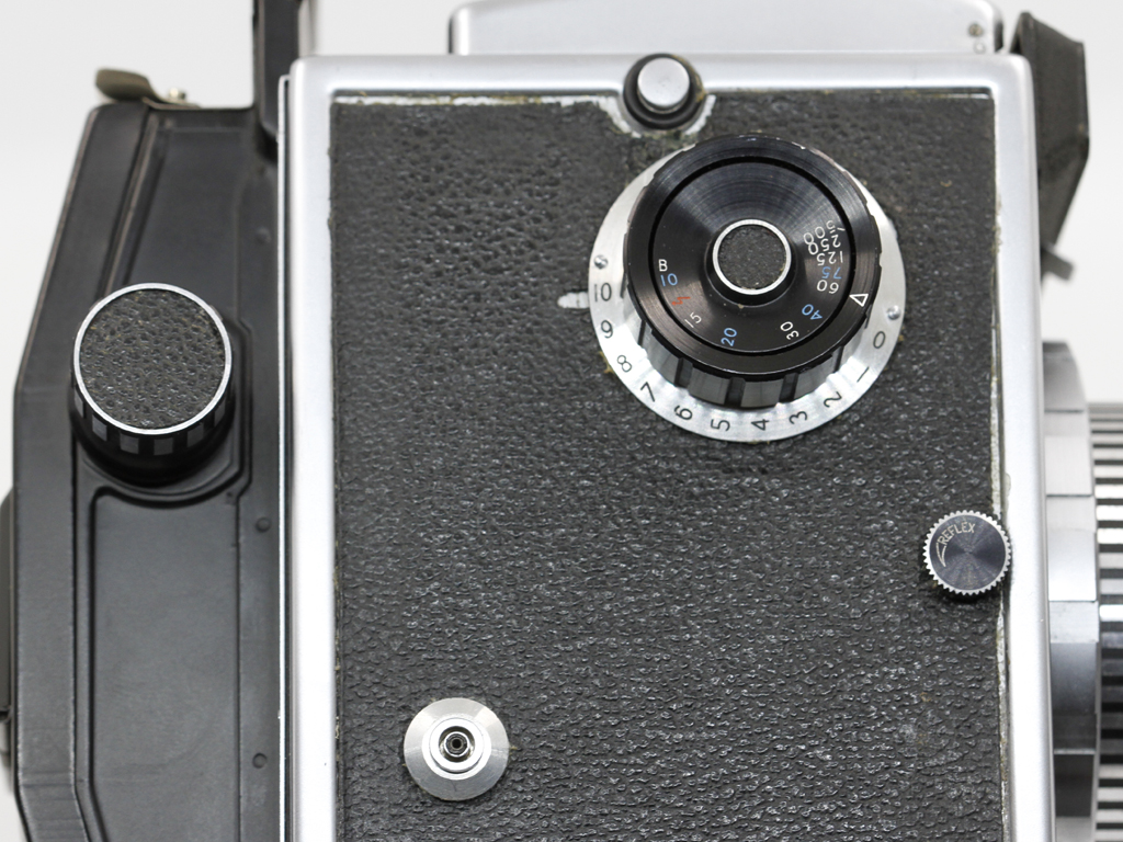 Surrounding the shutter speed knob is a silver dial with numbers engraved in black from 0 to 10. These relate to the flash sync timings for various bulbs for which a card was supplied detailing what setting is required for a particular bulb type. To set, the dial is simply turned to match the number to an arrow on the body. A mirror lock up facility was also provided which could be engaged by first of all pressing the release button to raise the mirror and then rotating the button marked reflex to engage the lock up. Once raised the mirror could be reset without exposure by turning the button in reverse direction.