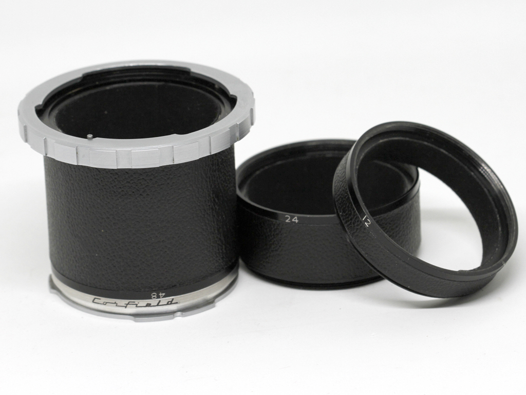 Accessories are limited to a fairly standard lens hood, the aforementioned rare handgrip and a set of extension tubes along with filters. The extension tubes seem easier to come by than the handgrip and quite well made to say the least. These take the form of three screw mounted tubes of 12, 24 and 48mm finished in black and matching leatherette trim to the camera. In use they are screwed in between two adapters, one is the bayonet tube to attach an extension tube to the camera, and the other is a flange tube (breech lock ring) to allow the lens to be mounted to the extension tube. Incidentally the two adapter rings can also be joined without a tube forming a 12mm extension tube. Again the fit and finish is to a very high standard. The only caveat being the flange tube often needs quite a bit of torque to clamp a lens due to dried grease, as said before though, a very easy fix.