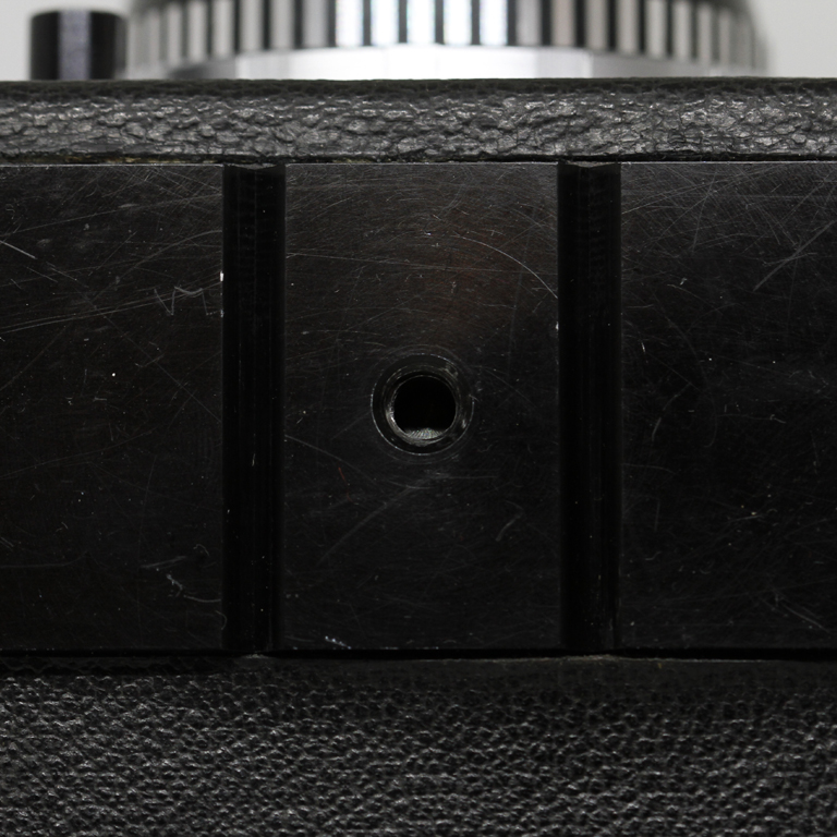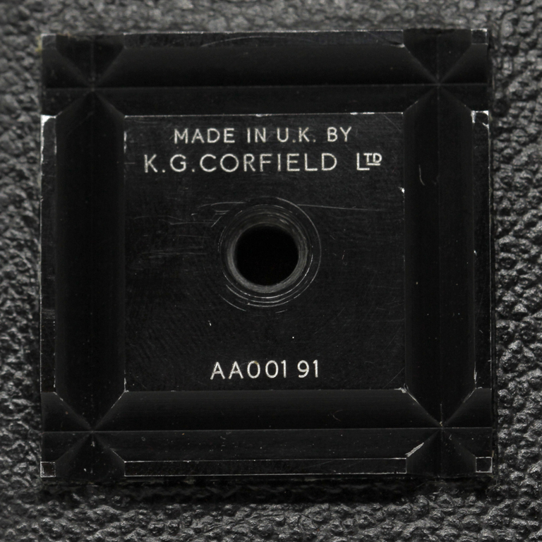 The left hand side of the camera provides the threaded square accessory bracket upon which the serial number is engraved. Thoughtfully it is rebated with a V shaped groove towards its edge on all four sides. This ensures that when the optional accessory handgrip is attached a raised metal bar engages in the groove ensuring it does not slip or rotate and unscrew itself, clever forward thinking by Corfield. This optional hand grip is now very scarce and difficult to come by, I am still searching for one. The base of the camera, normally the most boring part to look at mimics the side accessory mount and also has large V grooves running either side of the tripod socket from front to rear. Was a tripod mount or head on the design table? There is no other reason for such machining.